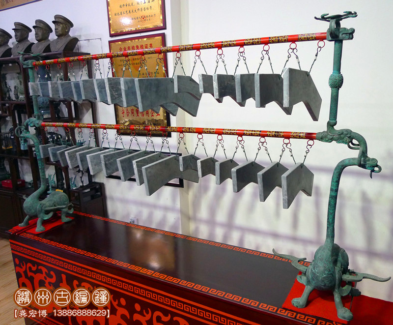 湖北省隨州市出土的“曾侯乙編磬”包括青銅鑄制的磬架和32塊可以發(fā)聲的響石組成,磬石分上下兩層懸掛,上層十六枚,下層十六枚。編磬由一對青銅怪獸承托,怪獸造型別致,形態(tài)怪異,將龍首、鶴頸、鳥身、鱉足結合為一體別有風趣,美觀協(xié)調。32塊磬石音域跨三個八度,十二半音齊備,音色清脆悅耳,獨具特色,音名為黃鐘、大呂、太簇、夾鐘、姑洗、仲呂、蕤賓、林鐘、夷則、南呂、無射、應鐘。這套編磬與曾侯乙編鐘密切配合,可在同一調高上進行合奏或同時轉調演奏。其音響效應“近之則鐘聲亮,遠之則磬音彰”,鐘磬和奏的天籟之聲被中外專家學者贊譽金聲玉振,金石之聲,相映生輝,相得益彰。