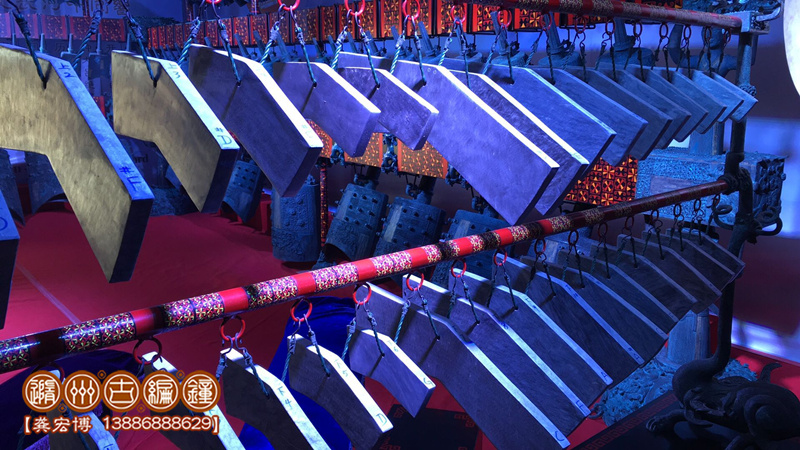 隨州市古編鐘文化發(fā)展有限公司通過考證歷史資料進行研究分析,并八方尋找石源,終于將這套2400多年前的戰(zhàn)國初期大型編磬復制出來,其發(fā)音與原編磬的標音銘文相符,低音渾厚洪高,高音明澈,音色優(yōu)美而動聽,音域達三個八度,可以旋宮轉調,演奏多種樂曲。