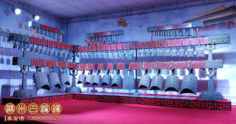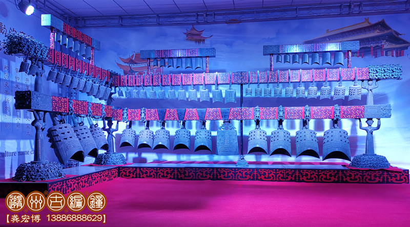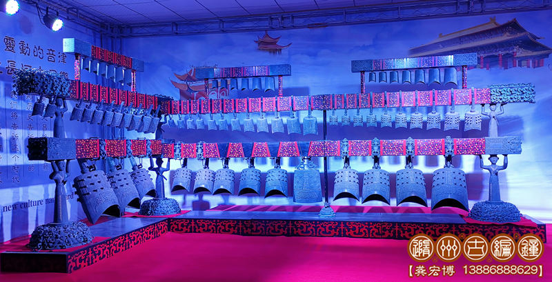 技術標準:鑄件要求紋飾清晰,表面光潔,無裂、刺、孔、糙等鑄造缺陷;整套編鐘音域5個八度,一鐘雙音,按國際標準A=440Hz調(diào)音,音準控制在±5Hz內(nèi),音色統(tǒng)一協(xié)調(diào),無雜、啞音響。其中下層13件為倍低音甬鐘,在演奏中起到烘托氣氛的作用,中層33件為中音域甬鐘,十二半音齊備,主要用于演奏主旋律,上層19件為被高音鐘和補音鐘,也是重要的半音和補充被高音音域,3組設計可以用于演奏復試旋律。其結構、配件、銘文等全部按照曾侯乙編鐘樣式仿制。