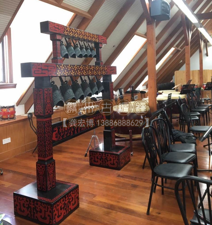 上海客戶定制的12件編鐘長2米、高2米、寬0.55米,分兩層懸掛了12件青銅編鐘,每件編鐘均可發(fā)出2個不同的樂音,半音齊備,采用A=440Hz標(biāo)準(zhǔn)調(diào)音,適合小型民樂團體使用,豐富了民樂團的整體音樂效果,從而獲得客戶的一致好評。